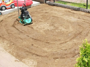 草の根を取り除いたら、機械を使って土を固めて平らな地盤を作ります。(地盤によっては砕石を敷き詰めます。)