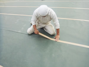 人工芝のつなぎ目部分ですが、片側に仮テープを貼り接合時に芝が巻き込まれるのを防止します。