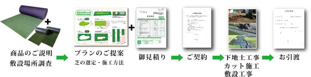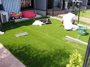 施工にお伺いする際には、予めある程度加工した芝を持ち込み、当日には芝の敷き詰めと充填剤をいれる作業をいたしますので、スムーズな施工が可能です。