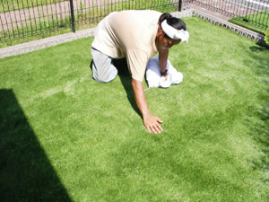 お客様から頂いた図面や現地調査を基に、ポストや植木などは回避して敷き詰めます。職人技で切れ目等は全く分りません。事前にあり程度加工した人工芝をもってお伺いします。