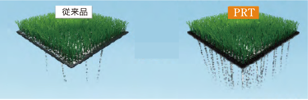 従来品※1(裏地がSBR=合成ゴム/PU=ポリウレタン)は透水穴から透水しますが、PRT人工芝はバッキング全面から透水するため、従来品に比べ、透水性が格段に優れています。