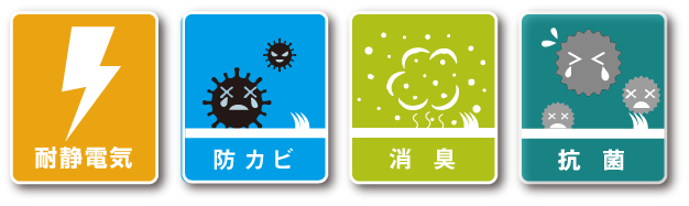 『静電気抑制』『抗菌』『防炎』の機能に『防カビ』と『消臭』の新機能を追加
